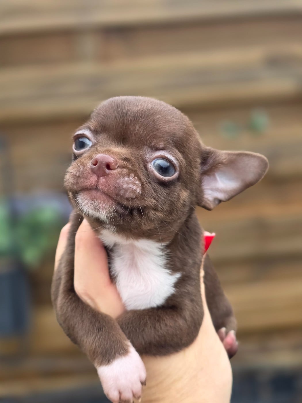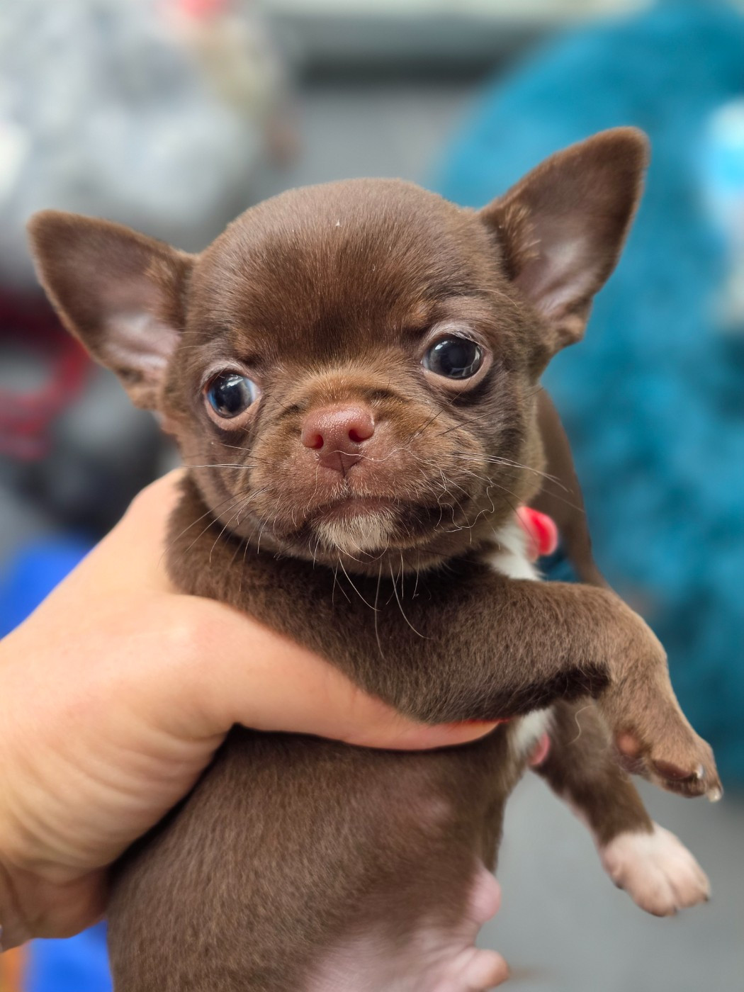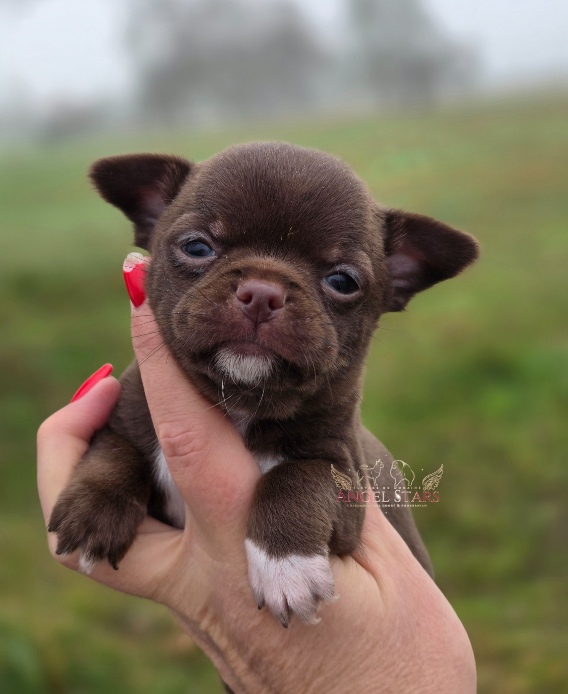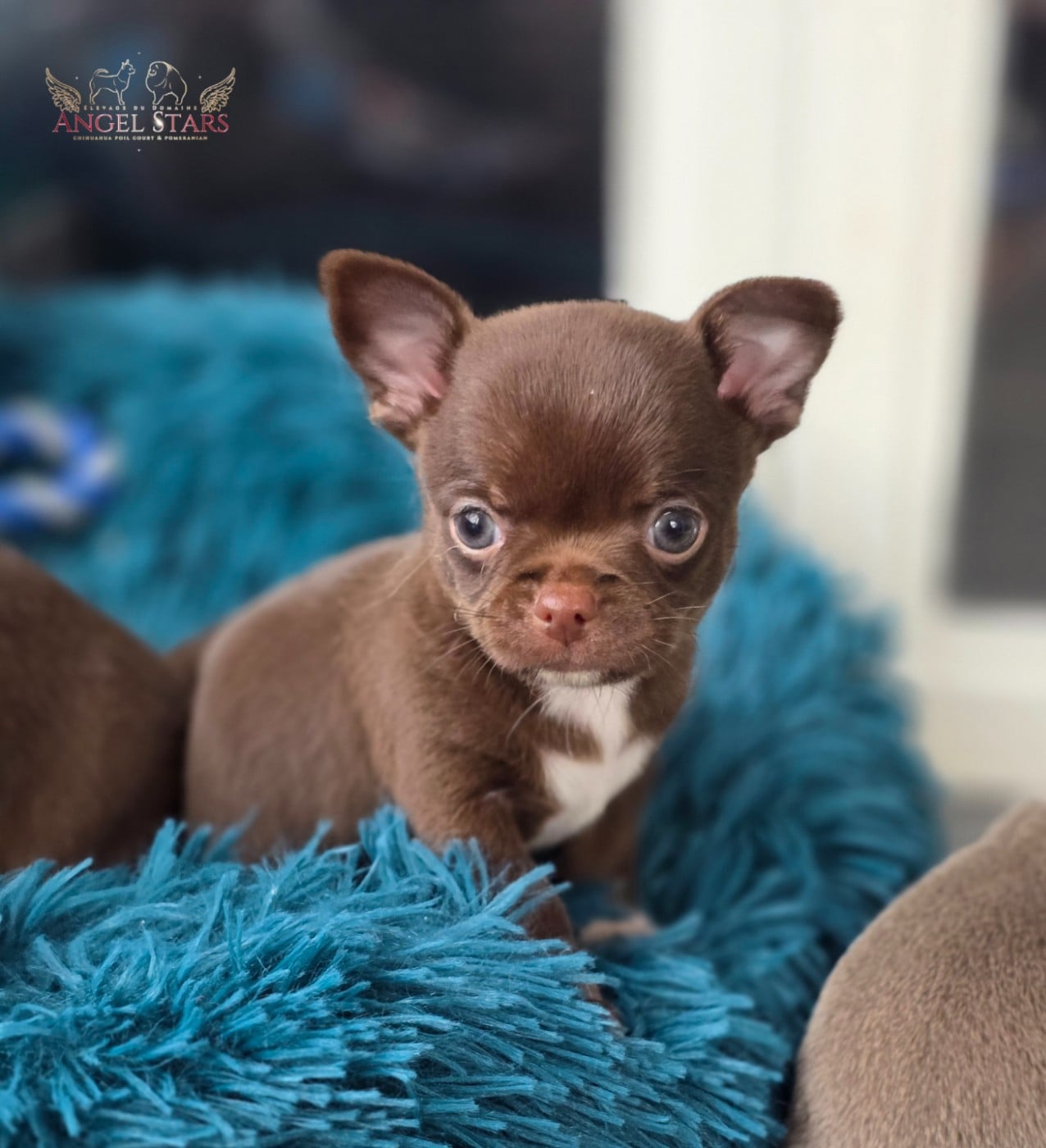 Sublime male bien typé. avec une jolie tête pommée. de couleur chocolat avec de petites chaussettes blanches et un plastron blanc. gabarit estimé entre 2kg et 2kg300.